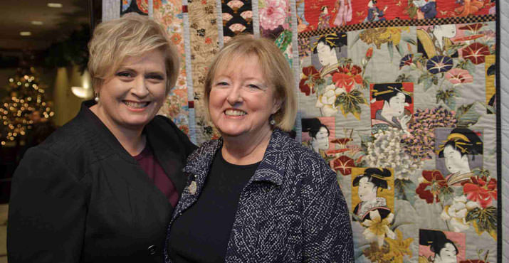 Auctioneer JillMarie Wiles and Kathy Wheatley stand before the Painted Ladies quilt Kathy made and donated.