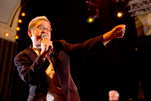 Pink Martini’s Thomas Lauderdale cheers on audience donations during his music set with The Von Trapps.