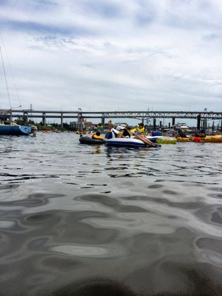 Portland, July 27th, 2014. The Big Float 4 took over the Willamette River in downtown Portland. The goal was to encourage people to “get into the river” and support its preservation and healthy development as a recreational resource. People also had a whale of a good time in the process. Floaters gathered at Tom McCall Bowl then carried their flotation devices and march south along Waterfront Park to the put-in point at “Poet’s Beach” beneath the Marquam Bridge. Floaters paddled down river and landed on the west bank at the Tom McCall Bowl. There they found Portland’s downtown beach party, complete with music barge and live bands, food carts, beer/wine garden, sponsor booths, and a kids’ activities area. (Photo credit, Point West Credit Union)