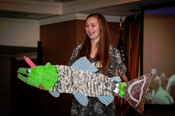Gladstone High School student, Emily Doll, displays trash artwork pieces she created during the live auction.