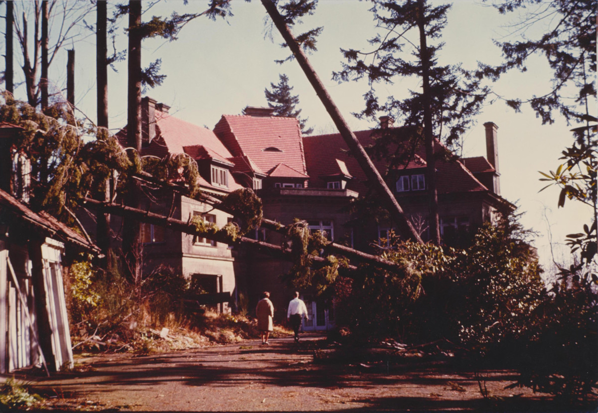 A damaged Pittock Mansion after the Columbus Day Storm of 1962. Developers planned to buy the damaged, molding mansion to replace it with a subdivision. Instead, Portlanders launched a grassroots fundraising campaign to save it. In 1964, the City of Portland purchased the estate for $225,000, including $67,500 raised by citizens. Repairs took 15 months. Workers fixed broken windows and replaced missing roof tiles. They replastered walls and ceilings, and flattened warped wood floors. On June 4, 1965, a restored Pittock Mansion opened to the public.