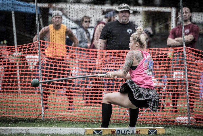 Felicia Baker was on target at the games with the The Scottish Hammer. The hammer is actually a 16-pound steel ball bearing that is bored out, with a cane handle fitted into it. The athlete swings the hammer in a circle overhead several times before releasing it from a twisted position. Because the athlete is throwing the hammer opposite the direction he is facing, spectators are encouraged to stay behind the safety screens.