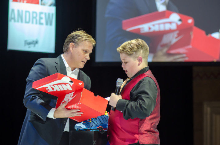 Portland, OR. 34 Nike designers and developers worked side-by-side with six young Doernbecher Freestyle designers to share their stories and bring their ideas to life. Doernbecher Freestyle XIV designers and models included: Tylan Hibbard, Brody Miller, Amyiah Robinson, Braylin Soon, Carissa Navarro, Andrew Merydith, Brayden Sparkman and Finn Mooney pictured with Doernbecher Physician-in-Chief, Dr. Dana Braner, OHSU President, Dr. Joe Robertson, and Doernbecher Foundation Board Trustee and Creative Director of Brand Presentation at Nike, Michael Doherty. Their designs were unveiled to the public at Doernbecher Freestyle XIV. The collection unveiling and auction raised over $1.4 million to help kids and their families at OHSU Doernbecher Children’s Hospital. In addition, Nike, along with Shoe Palace, Villa and Elite Mr. Alan’s, presented Doernbecher with a gift totaling more than $1.4 million from the retail sales of the 2016 Freestyle Collection – bringing the total raised from this partnership to nearly $20 million. (Photo credit, Caitlin Carlson and Andie Petkus)