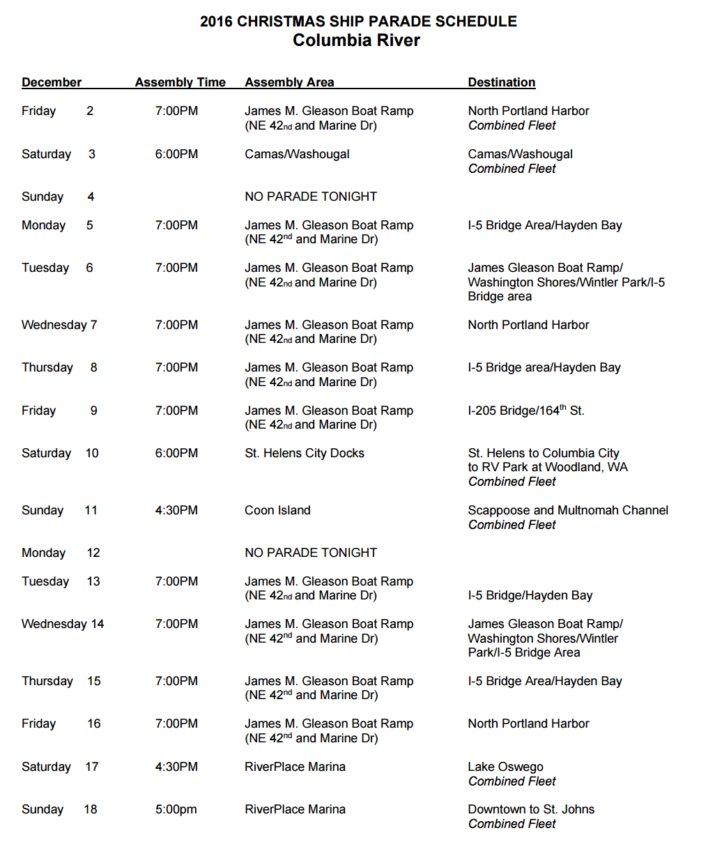 Portland, OR. This December will mark the 65th launch of the Christmas Ships Parade season. Parades on the Columbia and Willamette Rivers will last for 15 nights beginning on Thursday, December 5th through Sunday, December 22nd. There are seven nights where the fleet with be combined. Please click the links below to see the schedules for more details: