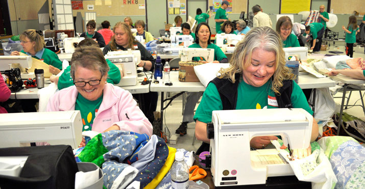 Community volunteer Pat and Comcast human resources manager Gina Fox sew blankets for children in need at Binky Patrol.Photo by Tracy Preston.