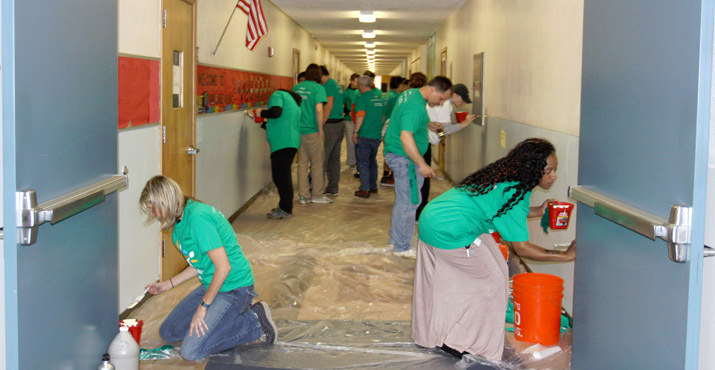 More than 300 Comcast Cares Day volunteers clean, paint, and spruce up the grounds of Parklane and Oliver elementary schools. Photo by Scott Cloud.